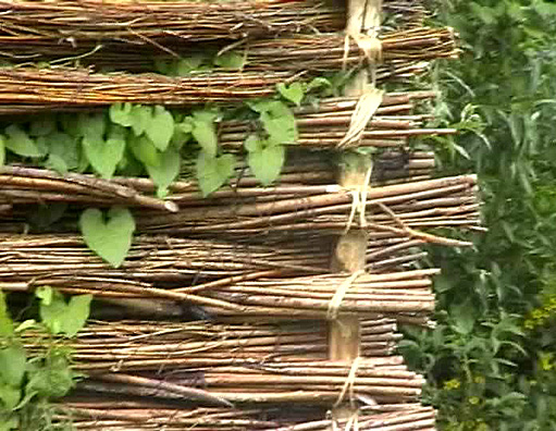 Gebruikt als vlechtmateriaal en tussen stevige kastanjepalenpalen gevlochten ontstaat een ruige, maar toch geordende tuinafscheiding.